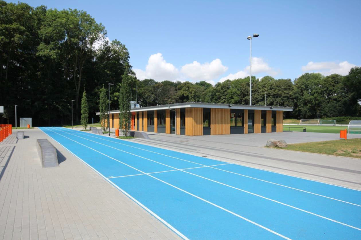 Neubau eines modernen Vereins- und Sportgebäudes an der ehemaligen Radrennbahn in Mönchengladbach mit allen benötigten Funktionsräumen.
